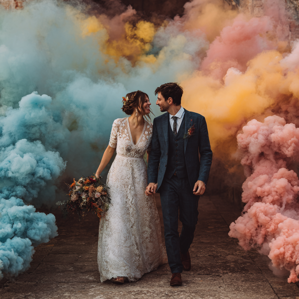 Dans le cadre d’un mariage ou d’un événement privé, ce format permet de créer des moments visuels forts en journée, là où l’on n’imagine pas toujours la pyrotechnie. Il peut accompagner une séance photo, une cérémonie laïque, une arrivée, ou marquer un temps clé de l’événement.